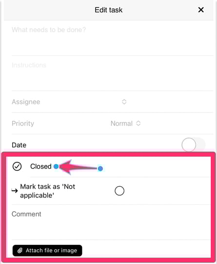 To mark a task as completed, just click on the checkbox next to the task, or click on the task. Here you will find the option to mark the task as "Closed". You can also mark it as "Could not do", and add a comment if you could not complete the task.