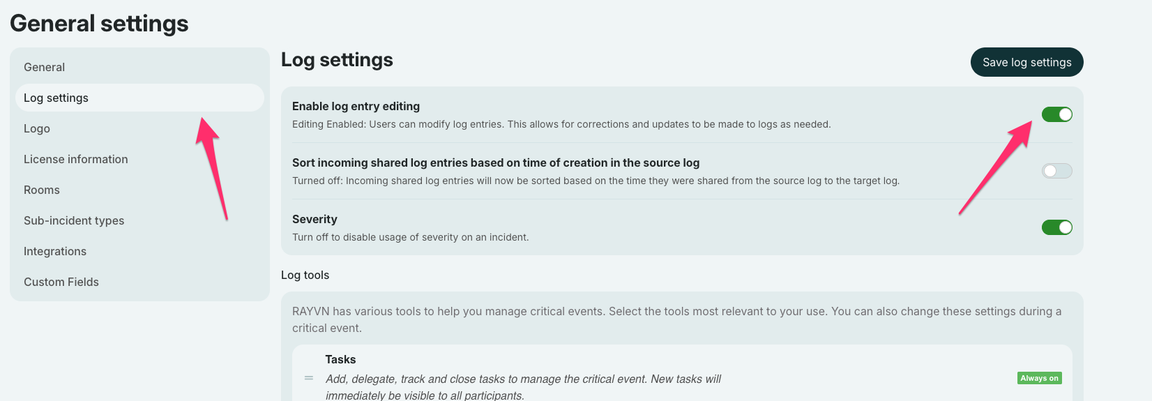 From here, you'll see the sections "Log settings", and "Log tools".
