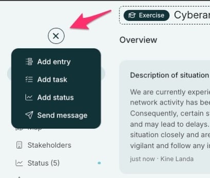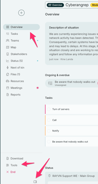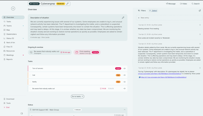 When you start a new log, you are taken to the overview page. This page quickly gives you a complete picture of the ongoing incident, with important information gathered in one place. Here, you can view the description of situation, ongoing and delayed tasks and meetings, planned tasks, and pinned statuses related to the incident.