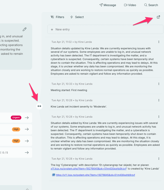 The log is displayed on the right side of the overview page. It is important for ensuring that everyone stays updated on what is happening and helps maintain a shared situational awareness. The log can be resized, you can expand or collapse it depending on how much space and focus you want it to have. To resize the log you have to move double arrow in the direction you want . You can also open it in a separate window, which is useful if you are working with two screens.