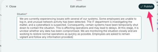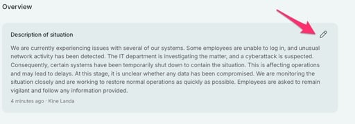 At the top of the overview page, you will find the "Description of situation". This provides all users to have a shared understanding of the situation. The situation description can be easily updated and edited throughout the incident. You can edit it by clicking the pencil icon in the upper right corner of the "Description of situation".