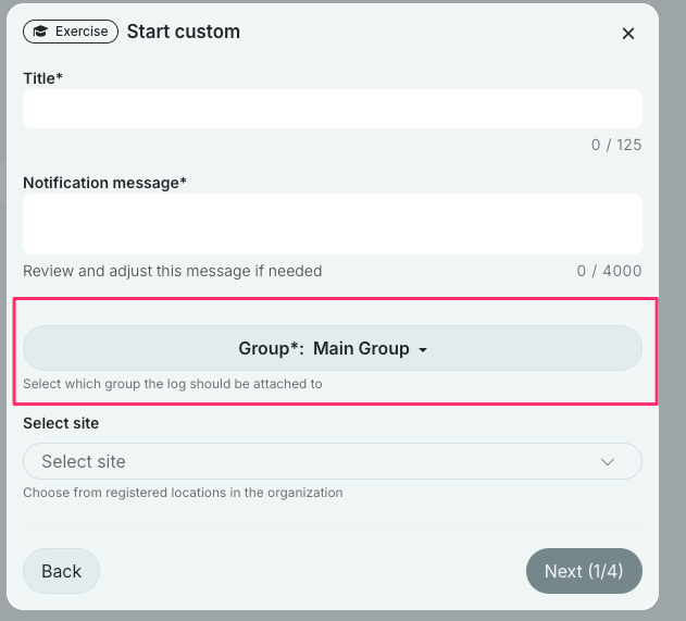 Users will see the hierarchy when clicking on “Start Log”. This user has access to the top level of Main Group and can see the whole business structure. Users who are connected to groups further down in the hierarchy will only see their group and below. A user connected to Company A would only see Company A and below. Each group in the hierarchy can have its own set of log templates with predefined scenarios, including teams, tasks, files, etc.