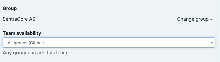 Below, we see that a team is defined as a Global team under the main group "SentraCore AS".