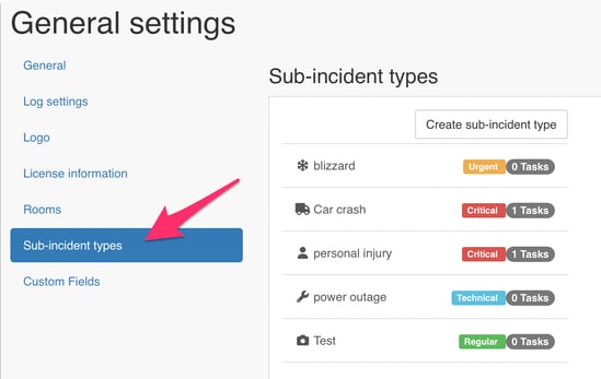 To view or edit incident types, click on the gear icon/settings in the upper right corner and select “Incident types”.