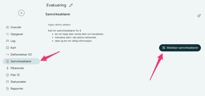 For å kalle in samvirkeaktører i en logg, må du trykke inn på "Samvirkeaktører" i verktøyslisten på venstre side. Der etter trykk "Mobiliser samvirkeaktører".