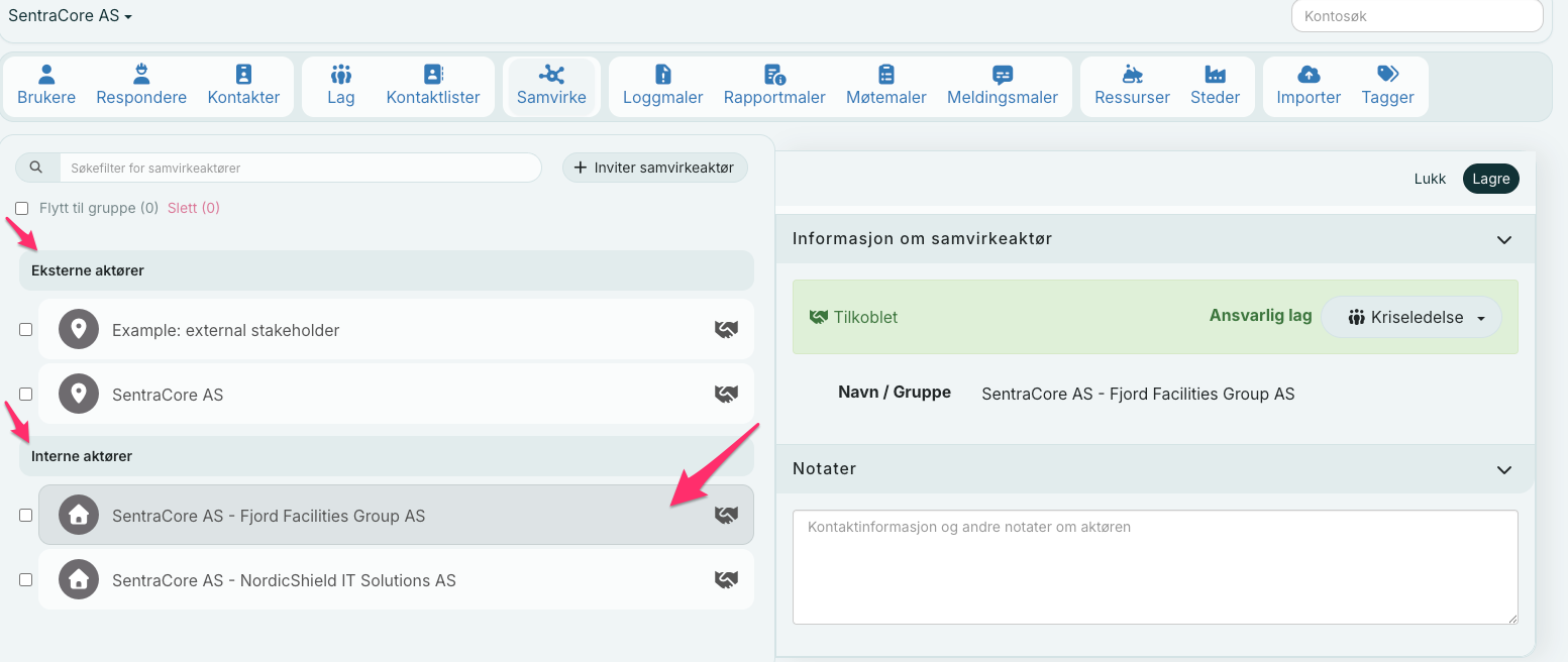 Under feltet "Samvirke" i kontoinstillingene kan du se en liste over alle interne og eksterne samvirkeaktører, så vel som informasjon og notater knyttet til hver samvirkeaktør.