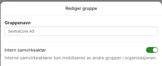 Her vil du se en bryter hvor du kan velge å gjøre gruppen til en intern samvirkeaktør. Når du klikker på denne bryteren, vil et nytt felt under dukke opp.