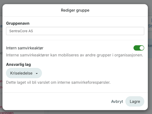 Her må du velge et "Ansvarlig lag". Et ansvarlig lag er det laget som vil bli varslet når samvirkeaktøren blir lagt til i en logg. Dersom du fjerner det ansvarlige laget, vil gruppen bli fjernet som samvirkeaktør. En gruppe må altså ha et ansvarlig lag for å kunne brukes som en intern samvirkeaktør.