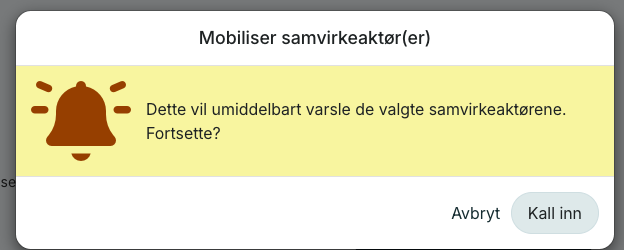 Når du har valgt dine valgte samvirkeaktører, og klikket "mobiliser samvirkeaktører", vil du se en varsel som spør om du er sikker på at du vil kalle inn aktøren(e), og at de vil bli varslet når du går videre.