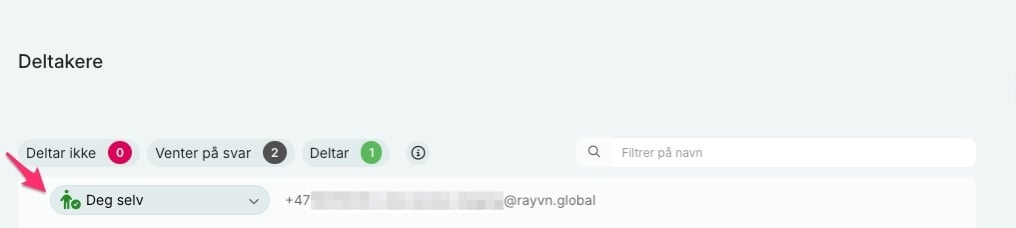 Dersom du logger rett inn i RAYVN og går inn i loggen uten å svare på varselet, vil RAYVN registrere at du er aktiv i loggen, og da automatisk endre deltakerstatusen din til "Deltar". Dersom du ikke kan delta, anbefaler vi derfor at du går til "Deltakere", finner din bruker, og endrer deltakerstatusen til "Deltar ikke".