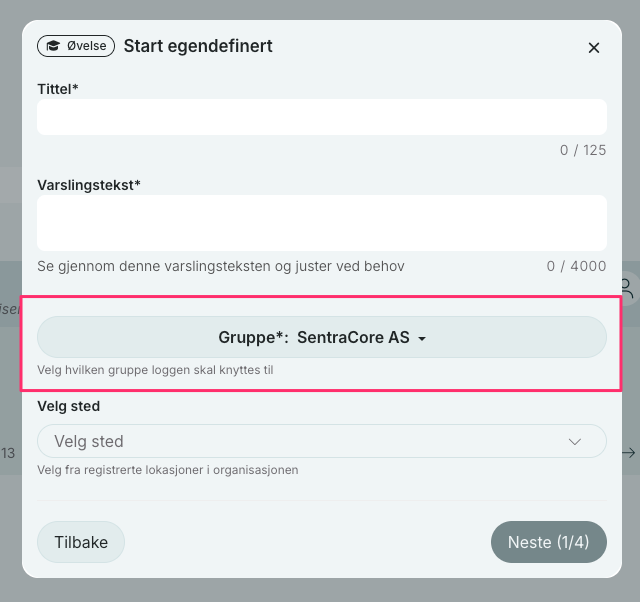 Brukere vil se hierarkiet når de klikker på "Start logg". Denne brukeren har tilgang til toppnivået i "SentraCore", og kan dermed se hele bedriftens struktur. Brukere som er knyttet til grupper lengre nede i hierarkiet vil kun se deres gruppe og eventuelle grupper under dem i hierarkiet.