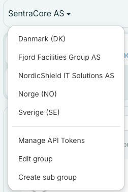 Her ser du hvordan en gruppestruktur kan se ut. Vi har "modergruppen" på toppen som i dette eksempelet heter SentraCore AS. Under "modergruppen" finner vi flere underordnede grupper som alle har hvert sitt innhold. Det er ingen automatisk overlapping av innhold mellom kontoene.