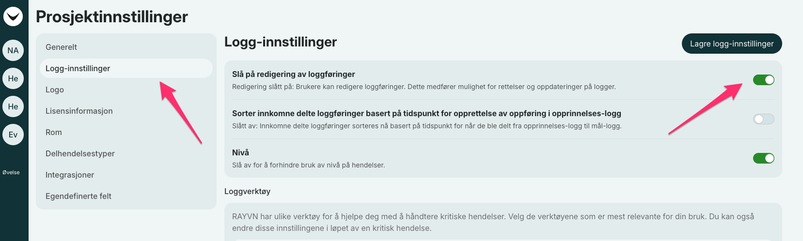 Dersom du ønsker å slå på muligheten for å kunne redigere loggoppføringer, gå til Prosjektinnstillinger, og velg deretter "Logg-innstillinger".