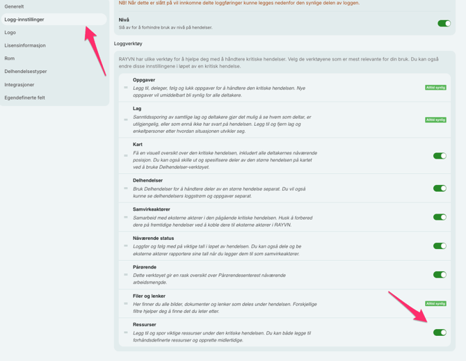 For å ha ressurser tilgjengelig i alle logger, er "Ressurser" er et verktøy som må aktiveres i "Loggverktøy" under "Prosjektinstillinger". I utgangspunktet er verktøyet utilgjengelig, og du må aktivere det ved å klikke på den lille bryteren til høyre for verktøyet: