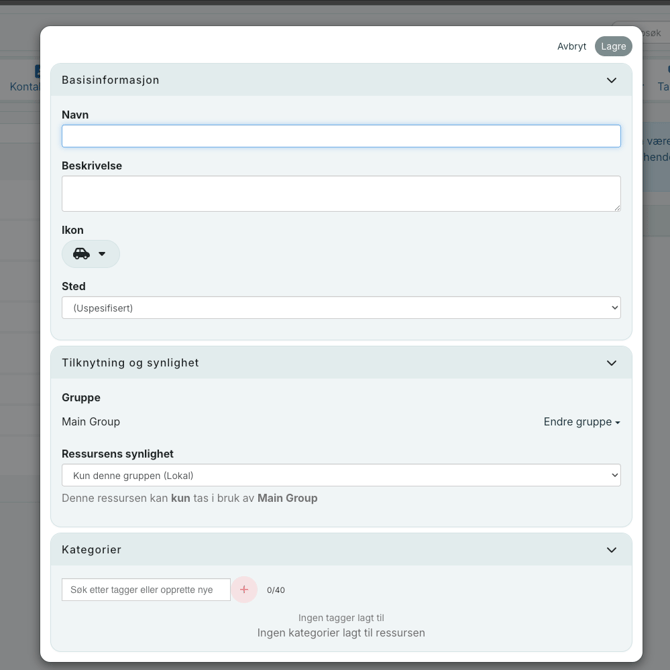 - Ressursens Tilknytning og Synlighet: Her kan du velge om ressursen skal være tilgjengelig i hele organisasjonen din (global), bare tilgjengelig i din gruppe og dets undergrupper (regional), eller kun tilgjengelig i en gruppe lokalt (lokal).