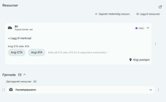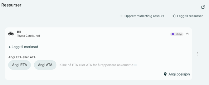 Når ressursene er lagt til i loggen kan du velge om du vil skrive et tilhørende notat, eller legge til ETA (Estimated Time of Arrival)/ATA (Actual Time of Arrival):