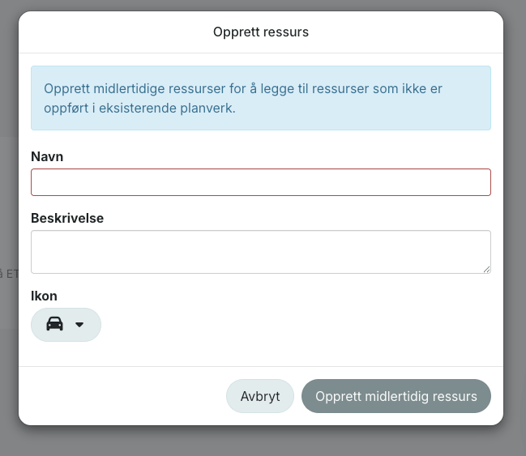 Det er også mulig å opprette midlertidige ressurser. Denne typen ressurser ser ut som, og oppleves som helt vanlige ressurser, men er kun tilgjengelige i den aktive loggen de er opprettet i.