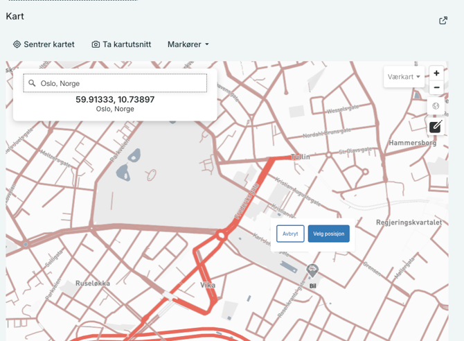 Klikk så "Angi posisjon", og velg posisjonen ved å skrive inn addressen, skrive inn koordinater, eller ved å bruke piltasten til å trykke på posisjonen i kartet. og trykk "Velg posisjon".