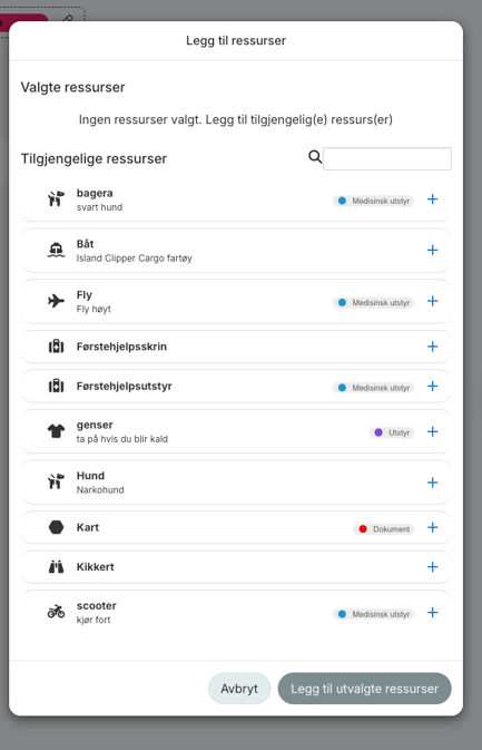 Ressurser er et hjelpsomt verktøy som kan brukes til å få kontroll over alle de materielle ressursene som er tilgjengelig i din organisasjon. I RAYVN brukes Ressurser til å lage representasjoner av organisasjonens fysiske materialer, som f.eks kjøretøy eller utstyr som kan benyttes i en hendelse.